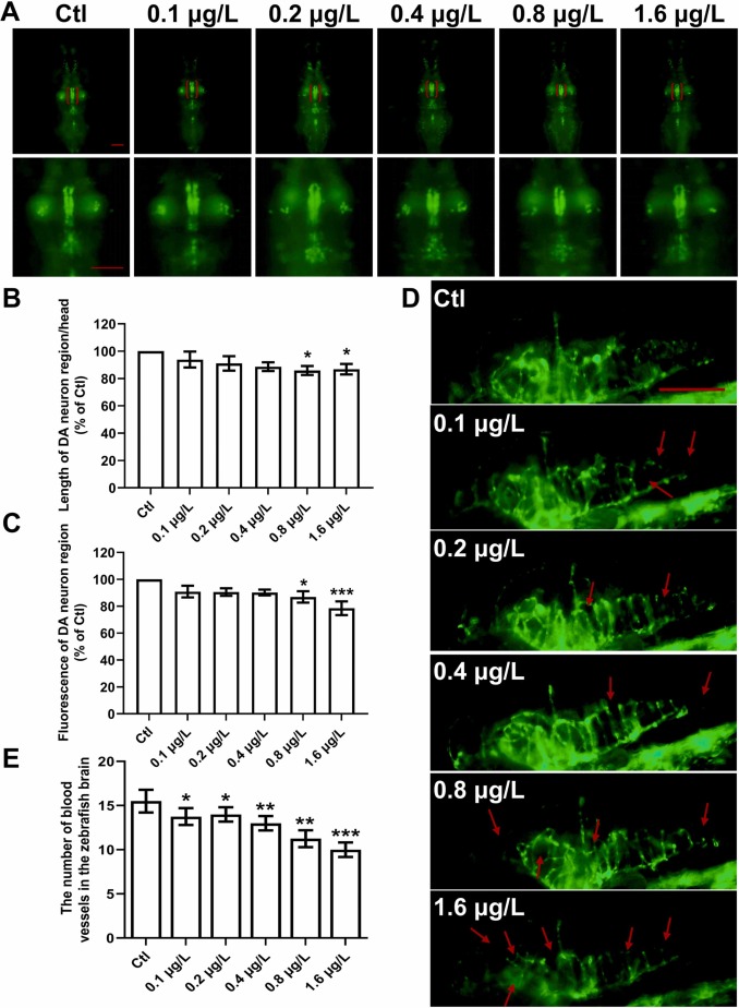 Fig. 2 UV-531 induces DA neuron damage, cerebral vessels deficits in zebrafish. (A) Fluorescence microscopy images of slc18a2:GFP zebrafish exposed to UV-531. Red brackets indicate DA neurons. Images were enlarged to improve visualization of DA neuron morphology. Scale bar, 150 μm. n = 15. (B) Statistical analysis of the length of DA neuron/head in each group (% of Ctl). n = 15. (C) Statistical analysis of the fluorescence of DA neuron region (% of Ctl) in each group. n = 15. (D) Representative fluorescence microscopy images of fli1:GFP zebrafish exposed to UV-531 up to 4 dpf. Red arrows indicate vessel damage. Scale bar, 150 μm. n = 15. (E) Statistical analysis of the number of blood vessels in the brain. n = 15. *p < 0.05, * *p < 0.01, * **p < 0.001 vs. Ctl.