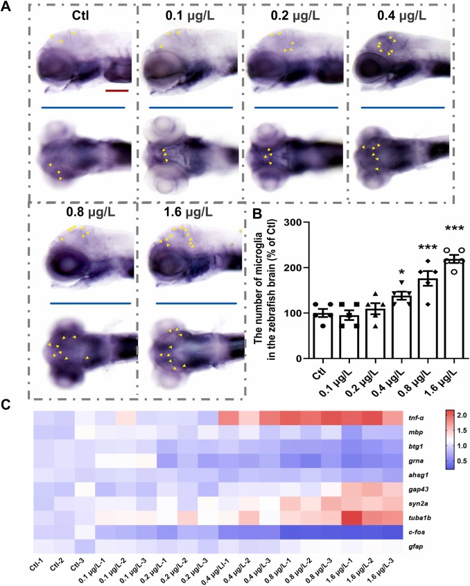 Fig. 5 UV-531 induces microglia activation and altered transcription levels of MS-related genes in zebrafish. (A) Expression of the microglia-associated gene apoeb in zebrafish at 6 dpf exposed to environmentally relevant concentrations. Yellow triangles represent microglia. The tests were repeated 3 times and n = 15 in each group. Scale bar, 100 µm. (B) Statistical analysis of the number of microglia in the zebrafish brain (% of Ctl) in each group. n = 15 (C) Heatmap of transcription levels of tnf-α, mbp, btg1, grna, ahsg1, gap43, syn2a, tuba1b, c-fos, and gfap. Red represents increased expression levels, blue represents decreased expression levels and white represents the baseline value. The tests were repeated 3 times and n = 30 in each group. *p < 0.05, * *p < 0.01, * **p < 0.001 vs. Ctl.
