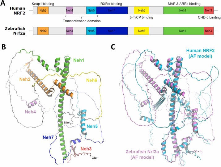 Fig. 1 Structural analysis of zebrafish Nrf2a and comparison with human NRF2. (A) Domain organization of human NRF2 (hNRF2), with the target binding partners indicated for each domain, and predicted domain organization for zebrafish Nrf2a. All seven Neh domains seem to be present in Nrf2a. (B) 3D-structure of zebrafish Nrf2a predicted with AlphaFold. In this model, long unstructured regions alternate with shorter regions adopting defined secondary structures, mostly α-helices. The Neh domains are represented with the same color code as in panel A. (C) Structural overlay of the AlphaFold-predicted model for zebrafish Nrf2a (light purple) with that of hNRF2 (cyan). The position of the secondary structure elements within the Nrf2a model matches well with those predicted for hNRF2.