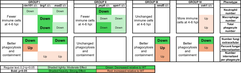 Mutants grouped by altered innate immune response. Mutant–phagocyte interactions were scored at 4–6 hpi, relative to wild-type fungi–phagocyte interactions in the same experiment, as to immune cell number and phagocytosis efficiency traits. Group I mutants had lower numbers of recruited phagocytes and better phagocytosis and containment. Group II mutants had fewer recruited phagocytes and unchanged phagocytosis efficiency. The Group III mutant had no change in phagocyte recruitment but better phagocytosis. The Group IV mutant had higher phagocyte recruitment and better phagocytosis. “Down” or “up” text indicates the direction of differential immune response, bold lettering indicates
