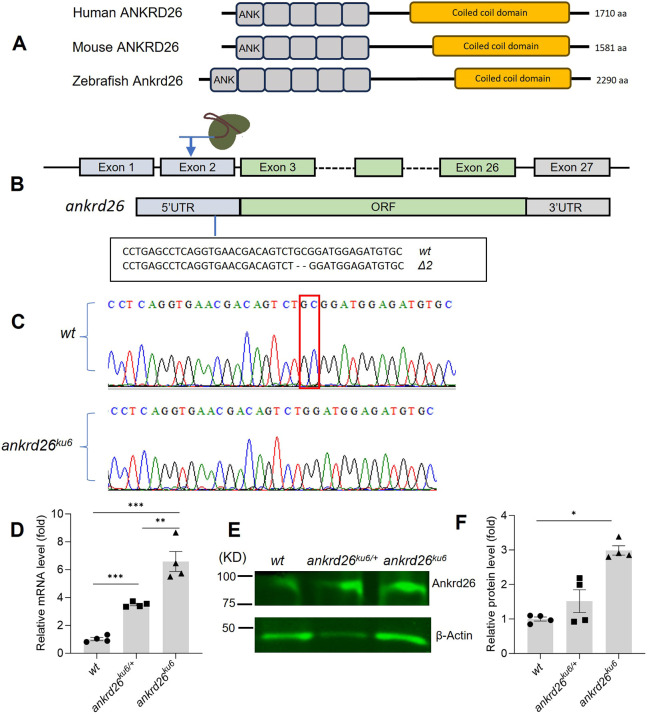 Generation and characterization of ankrd26ku6 zebrafish. (A) Schematic representation of human, mouse and zebrafish Ankrd26 protein, comprising N-terminal ankyrin (ANK) modules and C-terminal coiled-coil domain. (B) Schematic representation of the genomic DNA structure of ankrd26 and its encoded mRNA, showing the targeted area in the 5′-untranslated region (5′-UTR) of ankrd26 by CRISPR/Cas9 and the two deleted nucleotides (nt) in the 5′-UTR (Δ2). ORF, open reading frame. (C) Sanger sequencing confirmed the deletion of a two-nucleotide (GC) sequence (boxed). This mutant allele was named as ku6 in ZFIN. (D) Relative ankrd26 mRNA levels in pooled wild-type (wt), ankrd26ku6/+ (heterozygote) and ankrd26ku6 (homozygote) zebrafish larvae (n=10) at 5 days post-fertilization (dpf). (E,F) Western blotting (E) and densitometric analysis (F) of Ankrd26 protein expression levels in wt, ankrd26ku6/+ and ankrd26ku6 zebrafish larvae. β-Actin protein was used as protein loading control in E. Data are means±s.e.m. of at least three independent experiments. Mann–Whitney U-test was used to analyze differences between two groups. *P<0.05, **P<0.01 and ***P<0.005.