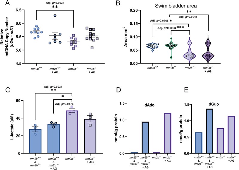 Assessment of purine deoxynucleoside supplementation in 7 dpf rrm2b larvae—. (A) Relative mtDNA copy number in vehicle treated (0.5% DMSO) 7dpf rrm2b+/+ (n = 9)(circles with thin border) & rrm2b−/− (n = 8)(squares with thin border) larvae and purine deoxynucleoside treated (50 μM dAdo & dGuo +5 μM ENHA in 0.5%DMSO) 7 dpf rrm2b+/+ (n = 7)(circles with thick border) & rrm2b−/− (n = 12)(squares with thick border) larvae. All results shown as mean ± SEM (statistical significance was determined with a Kruskal-Wallis test, **adj. P < 0.01). (B) Swim bladder area of 7 dpf vehicle treated (0.5% DMSO) rrm2b+/+ (n = 19) (circles with thin border), rrm2b+/− (n = 40) (diamonds), rrm2b−/− (n = 18) (squares with thin border) and purine deoxynucleoside treated (50 μM dAdo & dGuo +5 μM ENHA in 0.5%DMSO) rrm2b−/− larvae (n = 20) (squares with thick border). All results are shown as mean ± SEM (statistical significance was determined with a Kruskal-Wallis test, * = adj. P < 0.05, ** = adj. P < 0.01, *** = adj. p < 0.001). (C) L-lactate in 7 dpf vehicle treated (0.5% DMSO) rrm2b+/+ & rrm2b+/− larvae (circles with thin border) and rrm2b−/− larvae (squares with thin border) and L-lactate in 7 dpf purine deoxynucleoside treated (50 μM dAdo & dGuo +5 μM ENHA in 0.5%DMSO) rrm2b+/+ & rrm2b+/− larvae (circles with thick border) and rrm2b−/− larvae (squares with thick border). For all conditions n = 3 pools of 20, 7 dpf larvae. All results are shown as mean ± SEM (statistical significance was determined with a one-way ANOVA, * = adj. P < 0.05,** = adj. P < 0.01). (D) Deoxyadenosine concentration (nmol/g protein) in pools (n = 80) of 7 dpf vehicle treated (0.5% DMSO) or purine deoxynucleoside treated (50 μM dAdo & dGuo +5 μM ENHA in 0.5%DMSO) rrm2b+/+ & rrm2b+/− and rrm2b−/− larvae. E. Deoxyguanosine concentration (nmol/g protein) in pools (n = 80) of 7 dpf vehicle treated (0.5% DMSO) or purine deoxynucleoside treated (50 μM dAdo & dGuo +5 μM ENHA in 0.5%DMSO) rrm2b+/+ & rrm2b+/− and rrm2b−/− larvae. Deoxycytidine monophosphate, dTMP: Deoxythymidine monophosphate, TK2: Thymidine kinase 2.