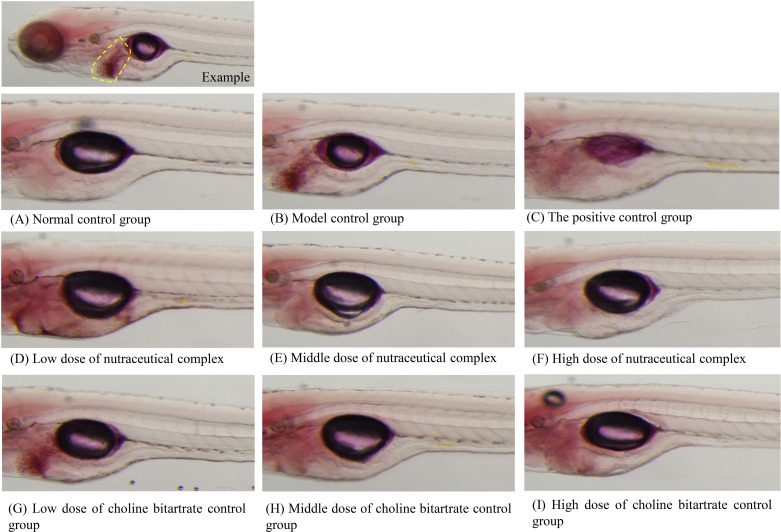 (A) Normal control group; (B) Model control group; (C) The positive control group: polyunsaturated phosphatidylcholine 50.0 μg/mL; (D) Low dose of nutraceutical complex: 125 μg/mL; (E) Middle dose of nutraceutical complex: 250 μg/mL; (F) High dose of nutraceutical complex: 500 μg/mL; (G) Low dose of choline bitartrate control group: 81.0 μg/mL; (H) Middle dose of choline bitartrate control group: 162 μg/mL; (I) High dose of choline bitartrate control group: 316 μg/mL. The location of the liver is marked with a yellow dotted line in the example figure.