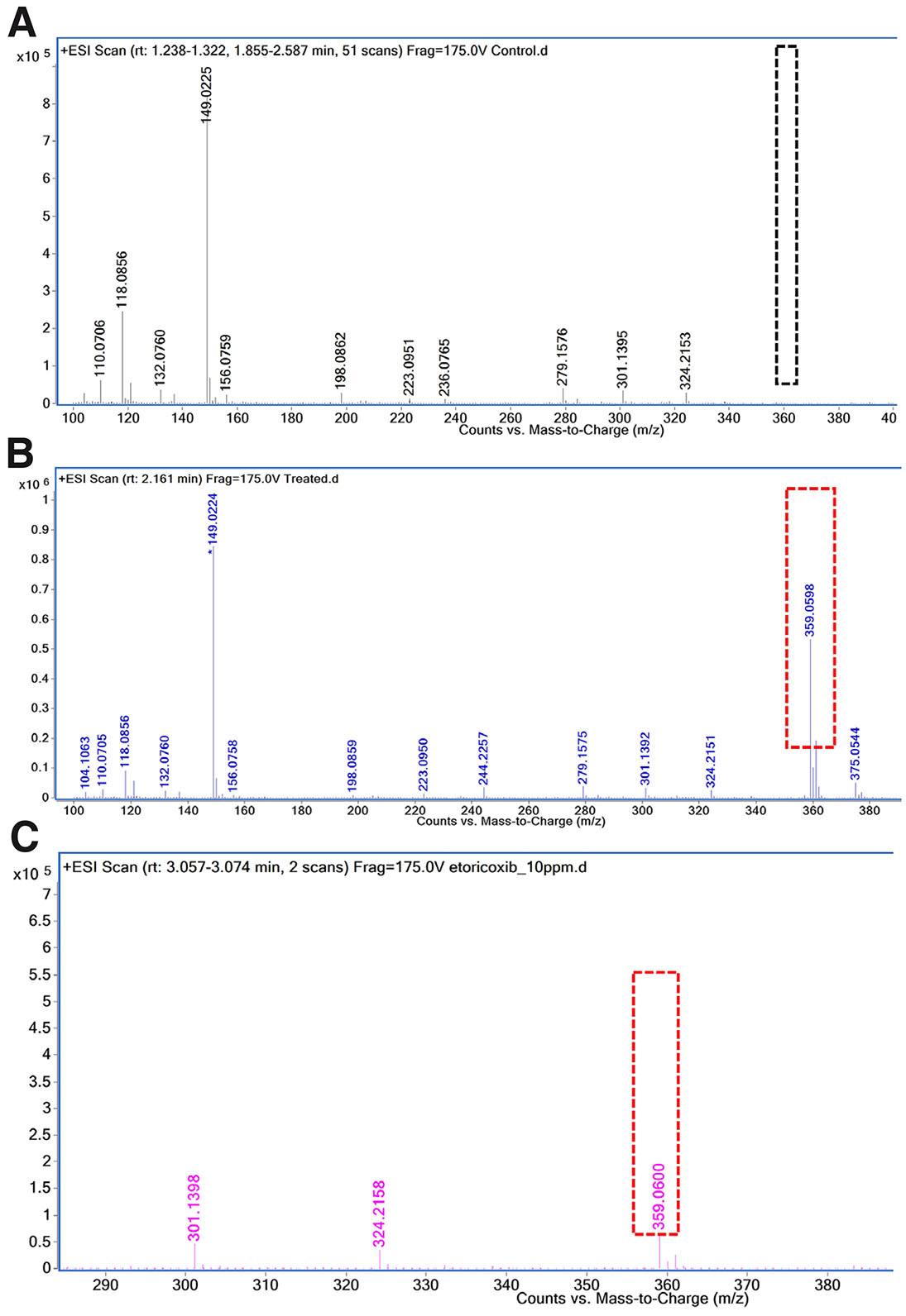 Fig. 1 Representative liquid chromatography-tandem mass spectrometry (LC-MS/MS) profile. (A) Control group. (B) Treated group. (C) Etoricoxib pure compound (Standard Solution). The etoricoxib fragment of M.W. (359) has been highlighted in a red dotted rectangle. A black dotted rectangle shows the absence of the corresponding peak.