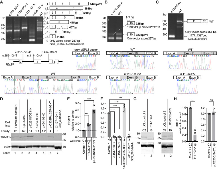 Fig. 3 TRMT1 variants induce splicing defects and changes in TRMT1 protein levels (A) RT-PCR analysis of RNA from HEK293T cells transfected with TRMT1 minigenes. The presence of additional bands in the WT is attributed to alternative splicing and quantified in Table S7. The splicing schematic is shown for each band to the right. The variant schematic is shown below. Sanger sequencing results showing the correctly spliced WT product with the deleterious variant effect, exon skipping, shown by the presence of only pSPL3 vector. The dotted box represents the short version of exon 5. (B) RT-PCR analysis of RNA from cells transfected with the c.1107−1G>A minigene. The splicing schematic is shown for each band to the right. Exon 10 with 1-bp deletion is represented with a dotted line corresponding to the single-bp deletion. (C) RT-PCR of the c.1194G>A variant. Asterisks represent assay artifacts. The splicing schematic is to the right. Assay design captured part of exon 12 that was correctly spliced in the WT control. (D) Immunoblot of lysates from fibroblast cell lines derived from control (C1) or affected individuals. (E and F) Quantification of TRMT1 levels relative to the control fibroblast cell line after normalization to actin. (G) Immunoblot of lysates from lymphoblast cell lines (LCLs) derived from control WT (C2) or affected individuals. (H) Quantification of TRMT1 levels in LCLs after normalization to actin. n = 3. Error bars represent standard deviation from the mean. Statistical analysis was performed using one-way ANOVA. ∗p ≤ 0.05, ∗∗p ≤ 0.01, ∗∗∗p ≤ 0.001, ∗∗∗∗p < 0.0001; ns, non-significant (p > 0.05).