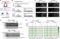 Fig. 2 Acute depletion of cohesin and WAPL-1 from somatic cells. (A) C. elegans subunits of cohesin and its regulators. (B) Transgenic strains used in this paper. Exogenously inserted TIR1 is expressed in somatic cells using the eft-3 promoter. Endogenous smc-3 or wapl-1 are C-terminally tagged with degron-GFP. (C) DAPI and GFP images of L3 stage worms. Arrow indicates that the proteins in the germline are not degraded upon auxin treatment owing to TIR1 presence only in the somatic cells. Scale bar, 100 μm. (D) Western blot images of L3 stage worms with increasing auxin treatment duration. Anti-GFP antibody was used to show global depletion of the tagged protein. Antitubulin antibody was used as loading control. Asterisk indicates background bands. (E) Metaplot of ChIP-seq data grouped into different chromosomes. Anti-GFP antibody was used to show uniform depletion of SMC-3 and WAPL-1.
