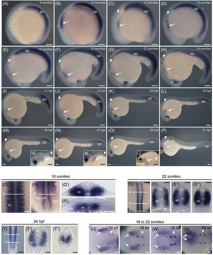 Fig. 1 Spatio-temporal expression of rbm24a transcripts during zebrafish development. (A–P) Lateral views, with anterior to the left, showing rbm24a expression in the developing somites from 8- to 24-somite stages (A–H) and progressively restricted to most caudal somites from 22 hpf to 31 hpf (I–P). (M′—O′) Higher magnifications of the anterior region. (Q, R) Dorsal views, with anterior to the top, of the embryo at 10-somite stage shown in B, at the level of the anterior and posterior re-gions, respectively. (Q', R') Transverse sections at the levels indicated in Q and R, respectively. Note that rbm24a is expressed in the entire somite and in adaxial cells of the presomitic mesoderm. (S) Dorsal view, with anterior to the top, of the embryo at 22-somite stage shown in G, focused on the posterior region. (S′–S″′) Transverse sections at the level indicated in S. (T) Dorsal view, with anterior to the top, of the embryo at 24 hpf shown in K, focused on the most posterior region. (T′, T″) Transverse sections at the level indicated in T. (U–X) Dorsal views, with anterior to the right, of embryos presented in B–G, at the level of the heart area. The expression of rbm24a is also present in the developing heart (white arrows), otic placode (arrowheads), and lens (asterisks). So, somite; nt, neural tube; n, notochord; ad, adaxial cells; fmp, fast muscle progenitors; upm, unsegmented presomitic mesoderm. Scale bars: 100 μm.