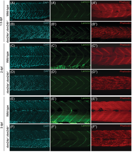 Fig. 9 Formation of myotendinous junction in rbm24a and rbm24b mutants. (A–F) DAPI staining. (A′–F′) Laminin immunofluorescence staining. (A″–F″) Phalloidin staining. Lateral view for all embryos, with anterior to the right. Notice that myofibers appear dispersed and disorganized in rbm24a and rbm24b mutant embryos, whereas the myotendinous junction of somite boundaries exhibit a pattern similar to wild-type embryos. At each developmental stage, 15 to 20 embryos per genotype were analyzed. Scale bar: 25 μm.