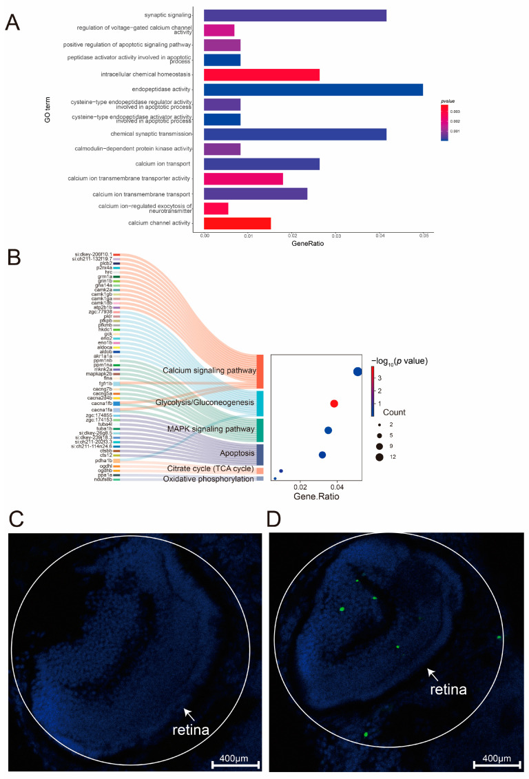 Enrichment analysis of differentially expressed genes in cdh23−/− reveals expression of Ca2+ pathway and cell apoptosis-related pathways. (A) GO enrichment analysis reveals differential expressions. Abscissa represents Gene Ratio, which is ratio of actual enriched genes in gene set for each GO term to total number of genes. Ordinate represents various enriched GO terms. p value measures significance of enrichment, with smaller values indicating greater statistical significance. (B) Differential expression genes with KEGG enrichment. Volcano plot shows enrichment of various KEGG terms and genes enriched in each pathway. Count value represents number of genes with different enrichment results. -log10 (p value) value measures the significance of enrichment, with a higher value indicating greater statistical significance. (C,D) Increased TUNEL staining in cdh23−/− retinas. TUNEL staining (green) on cryosections of 3 dpf zebrafish retinas revealed apoptotic cells. Zebrafish larvae were embedded for transverse sectioning. Scale bar = 400 μm.
