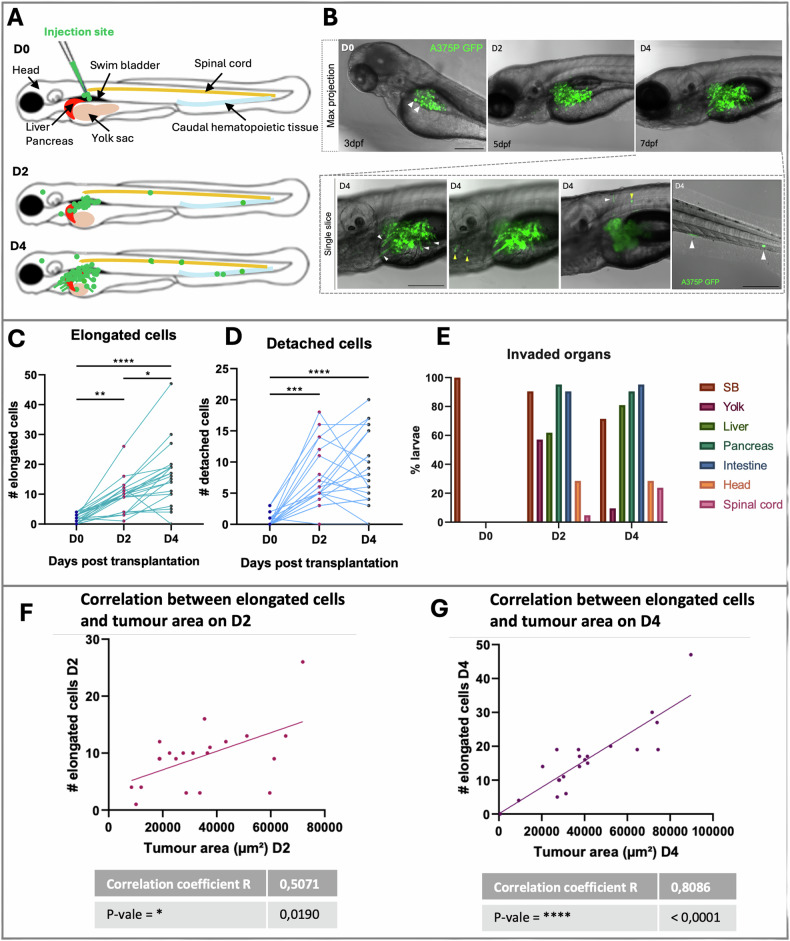 Fig. 2 In vivo invasiveness and dissemination of A375P cells after xenografting in larval zebrafish.