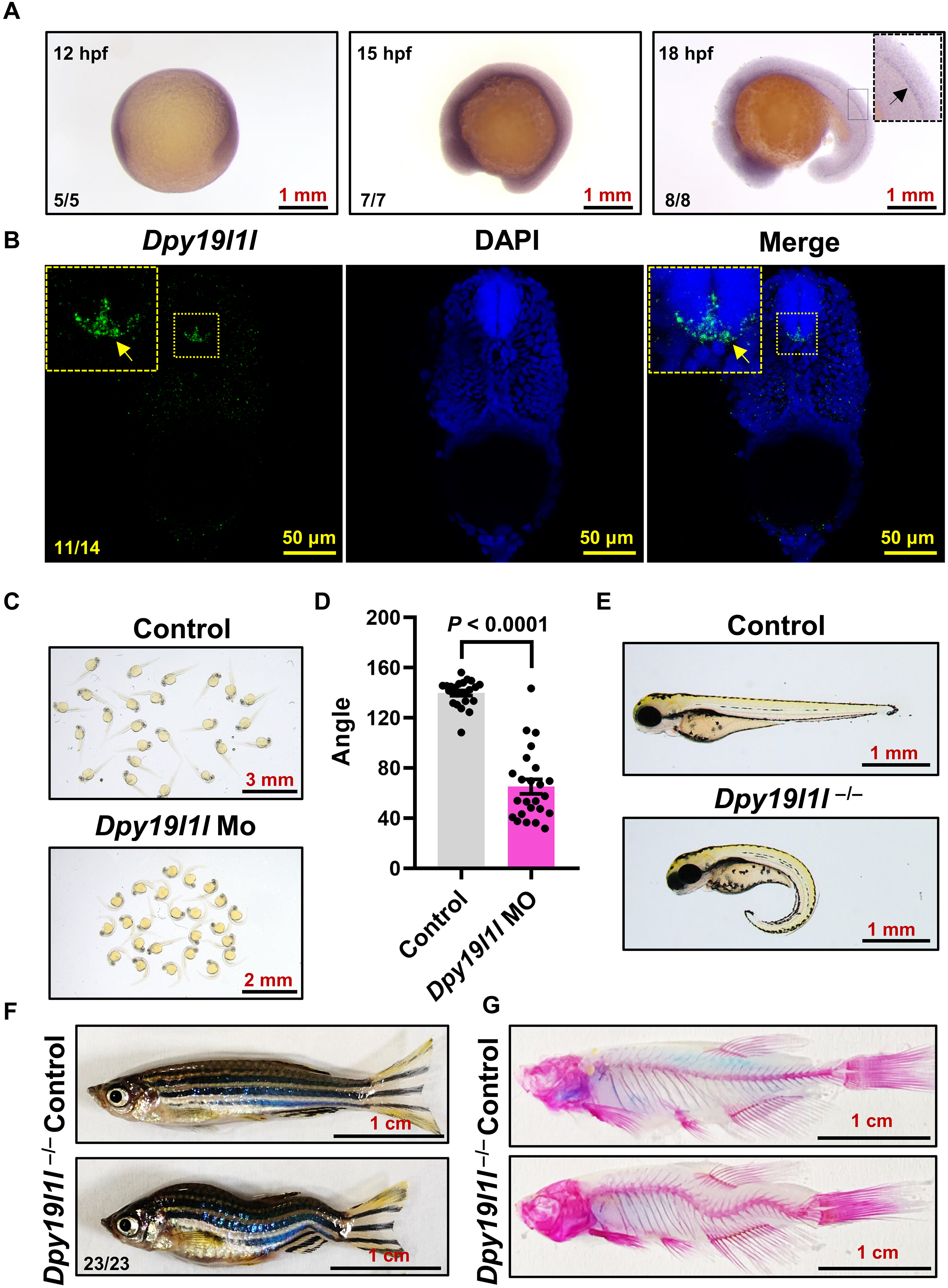 Fig. 1 Dpy19l1l expression in the spinal cord and its mutation leading to IS-like body axis curvature. (A) WMISH of dpy19l1l at 12 to 18 hpf. The arrow in the enlarged view of 18 hpf larvae indicates dpy19l1l expression. (B) Confocal projection of longitudinal trunk sections from 36 hpf larvae hybridized with a fluorescence riboprobe and 4′,6-diamidino-2-phenylindole (DAPI). The yellow arrow in the enlarged view marks dpy19l1l expression in spinal cord floor plate cells. (C) Phenotypes of dpy19l1l MO-injected larvae at 36 hpf, showing body axis curvature. (D) Quantification of body axis angles using ImageJ (bar graph; means ± SEM, n = 24). The P value (unpaired t test) is indicated above bars. (E) External phenotypes of control sibling and dpy19l1l−/− mutants at 2 dpf. (F) External phenotypes of adult control sibling and dpy19l1l−/− mutants. (G) ARS staining of adult control sibling and dpy19l1l−/− mutants.