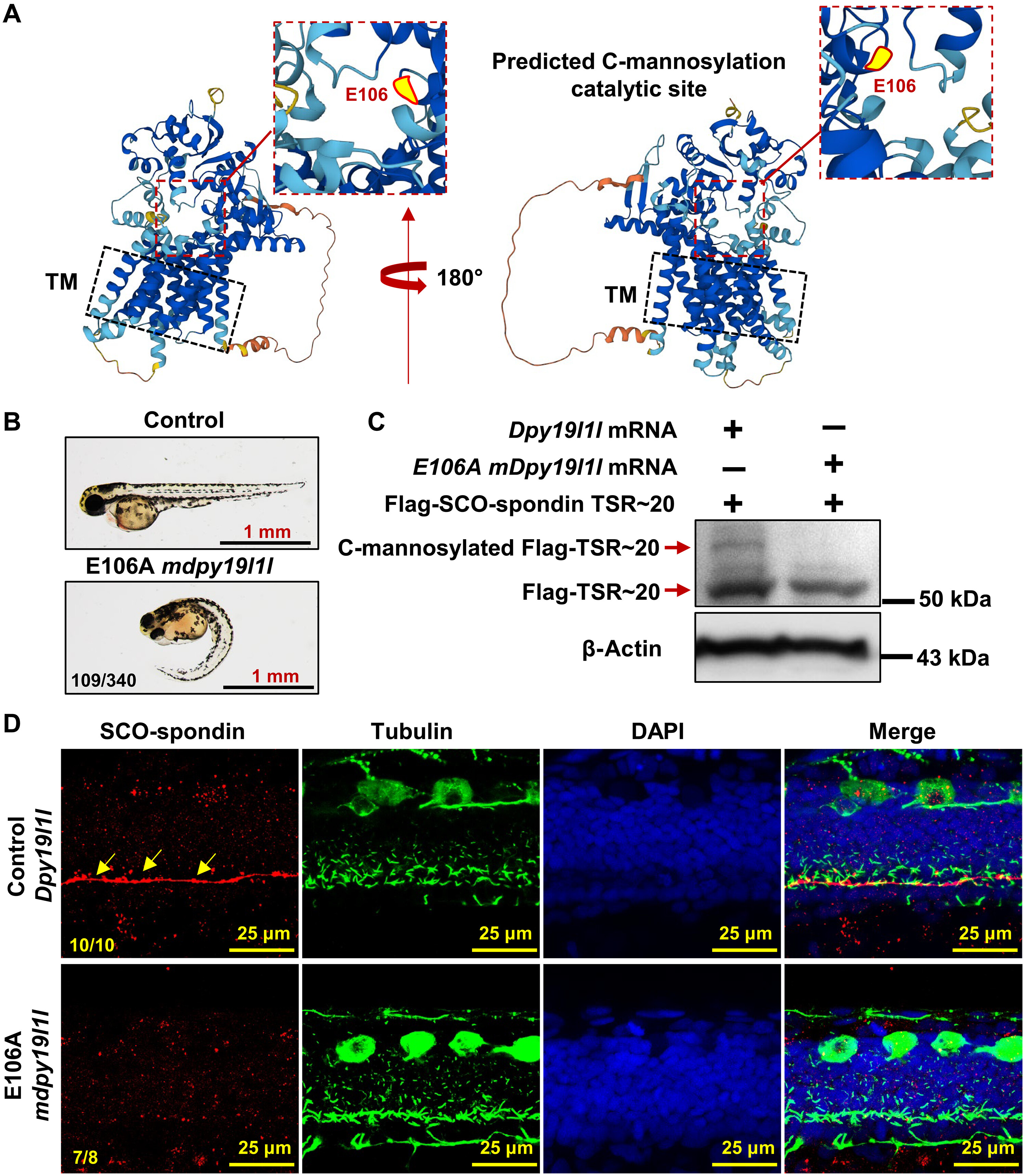 Fig. 5 DPY19L1L C-mannosylates SCO-spondin TSR motifs. (A) AlphaFold-predicted DPY19L1L structure. Red box highlights the catalytic core; yellow dot marks putative C-mannosylation site (E106). TM, transmembrane region. (B) Phenotypes of wild-type embryos injected with E106A dpy19l1l mRNA at 48 hpf. (C) Immunoblot of Flag-TSR~20 lysates from injected embryos. Anti-Flag detects Flag-TSR~20 and C-mannosylated Flag-TSR~20. (D) RF localization (red) in wild-type embryos injected with control or E106A dpy19l1l mRNA (36 hpf). Red: SCO-spondin; green: cilia; DAPI: nuclei. Yellow arrows indicate RF in controls.