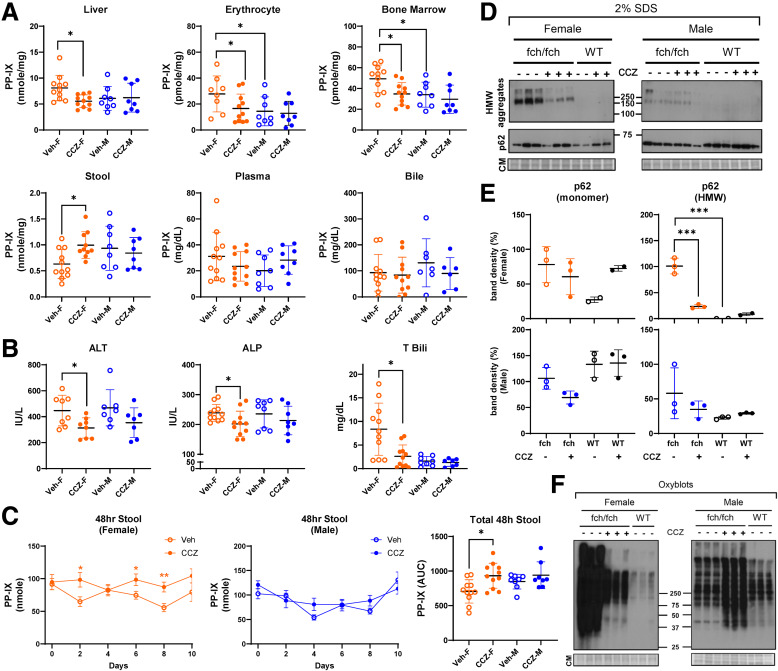 Fig. 3 CCZ reduces tissue PP-IX levels and liver injury and protein oxidation in female but not male fch/fch mice. (A) PP-IX levels in the liver, erythrocytes, bone marrow, internal rectal stool, plasma, and bile. (B) Plasma ALT, ALP, and total bilirubin levels. (C) Cage stool was collected every 48 hours. Stool PP-IX levels were then measured. Total stool PP-IX level over the 10-day study period was calculated using the integrated area under the fluorescence curve. Data are shown as mean ± SD (n = 8–11 mice/group, N = 2 experiments). Statistical analysis was performed by ANOVA test, ∗P < .05. (D) Immunoblots of p62 monomer and its high molecular weight aggregates in 2% SDS-containing buffer. (E) Densitometry analysis of p62 monomer and high molecular weight aggregates. Statistical analysis was performed by 2-tailed Student t-test, ∗∗∗P < .001. (F) Oxyblots of total fch/fch or wild-type livers treated with the vehicle PBS or CCZ. CM, Coomassie staining.