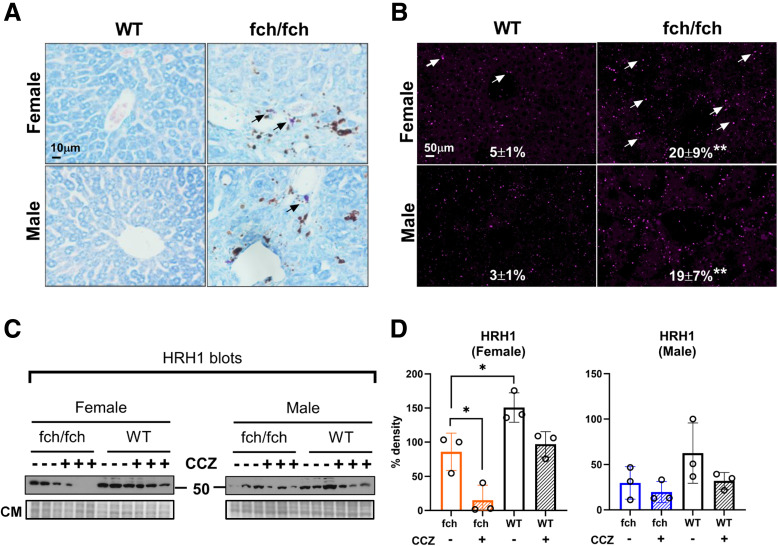Fig. 7 MC presence and HRH1 expression in wild-type and fch/fch livers. (A) May-Grunwald Giemsa staining of wild-type and fch/fch livers. Mast cell staining is highlighted by black arrows. (B) Immunofluorescence staining of MCP1 in wild-type (WT) and fch/fch livers (MCP1 puncta are indicated by white arrows) with quantified relative staining shown. The MCP1 staining images of the fch/fch (PBS) group in figures 7B (right panels) and 8A (first and third panels from left) were taken from a representative mouse liver section. Quantification is based on a group of immunofluorescence stainings (n = 3 livers, 2 image fields per liver). Another group (n = 2 livers, 2 images fields per liver) manifested a similar trend. (C) Immunoblots of the histamine receptor H1 (HRH1) in total liver lysates obtained from fch/fch and WT female and male mice with or without treatment with CCZ. (D) Densitometry analysis of HRH1 expression shown in panel C. HRH1 expression is suppressed in female fch/fch mice when compared with their WT controls, and CCZ further decreases HRH1 expression preferentially in female livers. Data are shown as mean ± SD (n = 3 livers/group). Statistical analysis was performed using the 1-way ANOVA test, ∗P < .05.