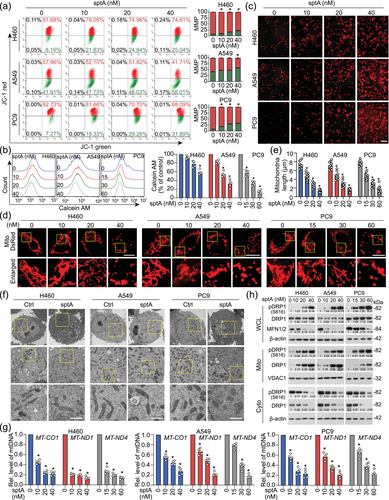 Fig. 3 sptA induces mitochondrial dysfunction in NSCLC cells. (a) Cells were treated with sptA for 24 h and stained with JC-1 to assess the ΔΨm (n = 5). (b) Cells were treated with sptA for 24 h, and mPTP opening was measured with flow cytometry using calcein AM dye (n = 5). (c) Cells were treated with sptA for 24 h. Mitochondria were stained with MitoSOX™ red FM, and mtROS accumulation was observed using confocal microscopy (n = 5). Scale bar = 50 μm. (d) Cells were transfected with Mito-DsRed for 24 h and then treated with sptA for 24 h; the mitochondria were visualised using confocal microscopy (n = 10). Scale bar = 10 μm. (e) The average mitochondrial length was determined for 10 cells in each experiment. (f) Cells were incubated with sptA (H460: 40 nM; A549: 40 nM; PC9: 60 nM) for 24 h. Ultrastructural features of mitochondria were detected using TEM (n = 5). Scale bar = 1 μm. (g) Cells were treated with sptA for 24 h. mtDNA was isolated and then analysed using qPCR (n = 5). (h) Cells were treated with sptA for 24 h. The whole cell lysate (WCL), cytosolic (Cyto) and mitochondrial (Mito) fractions were isolated and then analysed using Western blot (n = 5). Data shown are means ± SD, with individual values in (b, e, g). *P < 0.05 significantly different from control (0 nM sptA).