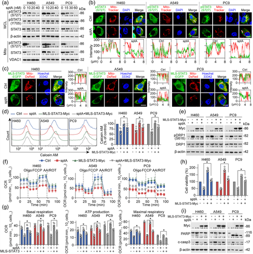 Fig. 4 sptA induces mitochondrial dysfunction in NSCLC by down-regulating mitoSTAT3. (a) Cells were treated with sptA for 24 h. The WCL and Mito fractions were isolated and then analysed by Western blot (n = 5). (b) Cells were treated with sptA (H460: 40 nM; A549: 40 nM; PC9: 60 nM) for 24 h, and mitochondria were then stained with MitoTracker Red and analysed using an immunofluorescence assay (n = 5). Scale bar = 15 μm. (c) Cells were co-transfected with MLS-STAT3-EGFP and Mito-DsRed for 24 h, treated with sptA (H460: 40 nM; A549: 40 nM; PC9: 60 nM) for 24 h and then observed using live cell imaging (n = 5). Scale bar = 15 μm. (d) Cells were transfected with MLS-STAT3 for 24 h and then treated with sptA (H460: 40 nM; A549: 40 nM; PC9: 60 nM) for 24 h. mPTP opening was measured with flow cytometry using calcein AM dye (n = 5). (e–i) Cells were transfected with MLS-STAT3 for 24 h and then treated with sptA (H460: 40 nM; A549: 40 nM; PC9: 60 nM) for 24 h (n = 5). Then, Western blot was performed (e, i). The OCR was detected with a Seahorse XF24 (f, g), and cell viability was evaluated using a CCK-8 assay (h). Data shown are means ± SD, with individual values in (d, g, h). *P < 0.05, significantly different as indicated.