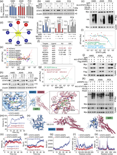 Fig. 5 sptA reduces mitoSTAT3 protein stability through WWP2-mediated ubiquitination. (a) Cells were treated with sptA for 24 h. qPCR was then performed (n = 5). (b) Cells were treated with PS341 (50 nM)/MG132 (1 μM) for 1 h and then treated with sptA (H460: 40 nM; A549: 40 nM; PC9: 60 nM) for 24 h. Western blot was performed (n = 5). (c) Cells were transfected with MLS-STAT3-Myc and HA-Ub for 6 h, treated with sptA (H460: 40 nM; A549: 40 nM; PC9: 60 nM) for 24 h and lysed. The lysates were immunoprecipitated as indicated (n = 5). (d) UbiBrowser web services analyses ubiquitin ligases that mediate STAT3 protein ubiquitination. (e–g) A549 cells were transfected with mCherry-tagged ubiquitin ligase plasmids or EGFP tagged MLS-STAT3 construct, and total protein was extracted and then incubated with sptA (n = 5). The MST assay was performed to determine the binding affinity. (h) DARTS assays were performed to assess the stabilising effects of sptA and indicated proteins (n = 5). (i) The binding affinity of purified STAT3 protein to mCherry-WWP2 in A549 cells in the presence and absence of sptA was evaluated by MST assay (n = 5). (j) Cells were co-transfected with MLS-STAT3-Myc and Flag-WWP2 for 24 h, treated with sptA (H460: 40 nM; A549: 40 nM; PC9: 60 nM) for 24 h and lysed, and then co-IP was performed (n = 5). (k) Cells were transfected with WWP2 siRNA mix (siWWP2) for 24 h. Next, the cells were co-transfected with MLS-STAT3-Myc and HA-Ub for 6 h, treated with sptA (H460: 40 nM; A549: 40 nM; PC9: 60 nM) for 24 h. The lysates were immunoprecipitated as indicated (n = 5). (l) Docking pose of sptA with STAT3 and WWP2. (m) Changes in the distance between the centres of STAT3-WWP2 with/without sptA (n = 5). (n) Changes in the average distance between the centres of STAT3-WWP2 with/without sptA (n = 5). (o) Backbone RMSD values for STAT3-WWP2 in the presence or absence of sptA during a 50 ns simulation (n = 5). (p) Changes in the Rg values for STAT3-WWP2 in the presence or absence of sptA (n = 5). (q) SASA values of STAT3-WWP2 with/without sptA (n = 5). (r) Changes in the RMSF values of STAT3 for STAT3-WWP2 with/without sptA (n = 5). (s) Changes in the RMSF values of WWP2 for STAT3-WWP2 with/without sptA (n = 5). Data shown are means ± SD, with individual values in (a, b). *P < 0.05, significantly different as indicated; n.s., not significant.