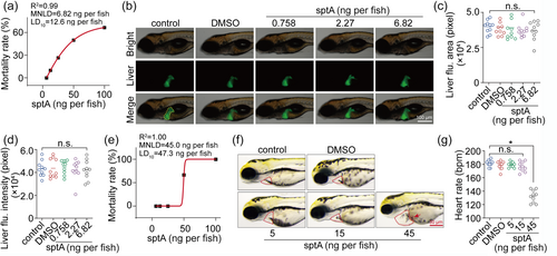 Fig. 7 Toxicological evaluation of sptA in zebrafish. (a) Liver toxicity ‘dose-mortality’ curve of sptA in zebrafish (n = 10). (b) Typical diagram of zebrafish liver toxicity after sptA treatment (n = 10). (c, d) Liver fluorescence area and liver fluorescence analysis of the livers of sptA-treated zebrafish at 48 hpe (n = 10). (e) Heart toxicity ‘dose-mortality’ curve of sptA in zebrafish (n = 10). (f) Typical diagram of zebrafish heart toxicity after sptA treatment (n = 10). (g) Heart rate of zebrafish treated with sptA for 48 hpe (n = 10). Data shown are means ± SD, with individual values in (c, d, g). *P < 0.05, significantly different as indicated, n.s., not significant.