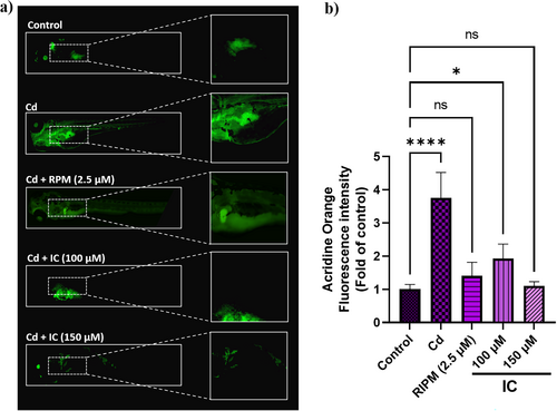 Fig. 7 Measurement of intracellular Apoptosis. (Cd denotes Cadmium; RIPM denotes Rapamycin). (a) Fluorescent image of intracellular apoptosis (b) Quantitative measurement of intracellular apoptosis. Triplicate experiments were conducted, and the results are represented as mean ± SD. The asterix (*) denotes the significance level compared to the control group. *p < 0.0332, **p < 0.0021, ***p < 0.0002, and ****p < 0.0001.