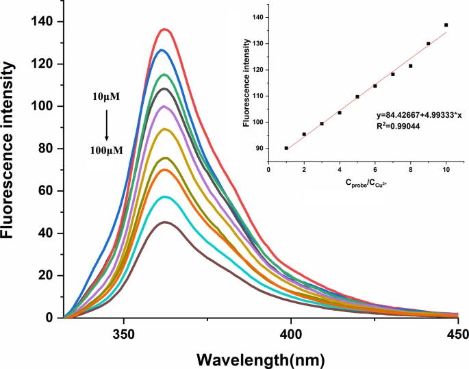 Fig. 5 Fluorescence response of Sensor 1 to Cu2+ in different concentrations in HEPES − NaOH buffer (pH = 7.4) − DMF(1/1, v/v) ( λex = 298 nm, λem = 365 nm, slits: 2.5 nm/2.5 nm)