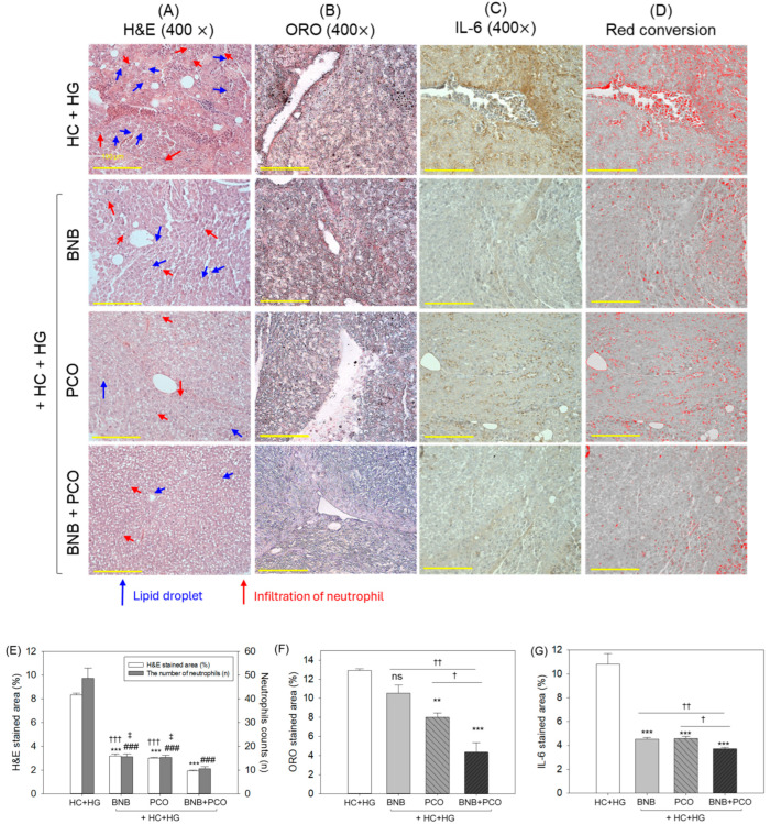 Histological analysis of hepatic tissue after 6 weeks of consumption of banaba (BNB, 0.1% w/w), policosanol (PCO, 0.1% w/w), and mixture of the banaba and policosanol (BNB+PCO, each 0.1%, w/w) supplemented with high cholesterol (HC, 4% w/w) and high galactose (HG, 30% w/w) diet. (A) Hematoxylin and eosin (H&E) staining, (B) oil red O (ORO) staining, (C) immunohistochemical analysis to detect interleukin 6 (IL-6), and (D) red conversion of the IL-6-stained area (to improve the visibility) using brown color threshold value 20–120 employing Image J software (https://imagej.net/ij, 1.53 version, accessed on 6 June 2023). (E) Quantification of H&E-stained area and neutrophil counts. (F,G) Quantification of ORO, and IL-6-stained area. The ** and *** underscore the significant variance at p < 0.01, p < 0.001 (for H&E, ORO, and IL-6-stained area), while ### underscore the statistical difference at p < 0.001 (for neutrophil counts) vs. HC+HG group. The †, ††, and ††† highlight statistical differences at p < 0.05, p < 0.01, and p < 0.001 (for H&E and IL-6-stained area), while ‡ represents the statistical difference at p < 0.05 (for neutrophil counts) vs. BNB+PCO group. The “ns ” highlights the non-significant difference vs. HC+HG group.