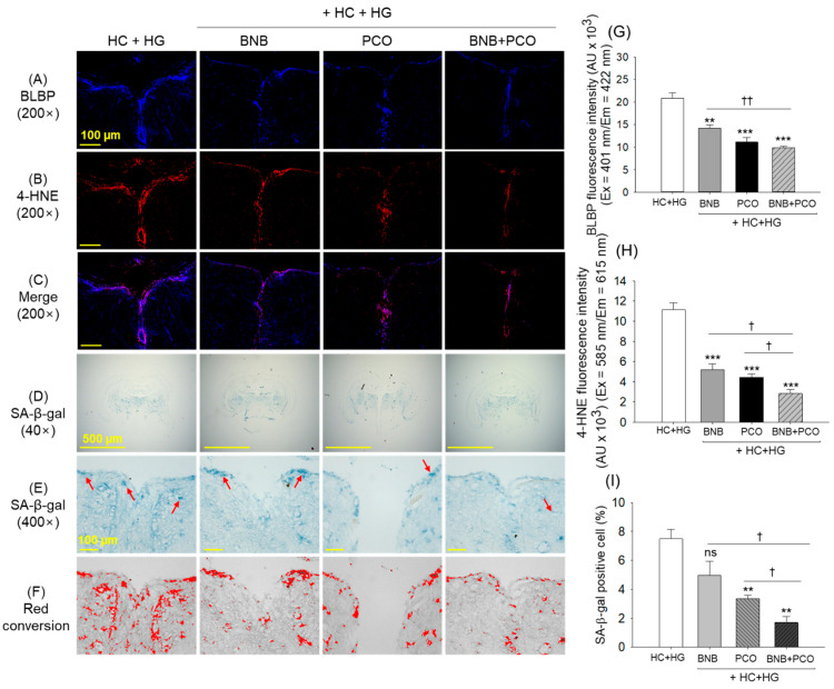 Comparison of brain lipid binding protein (BLBP), 4-hydroxynoneal (4-HNE) levels and cellular senescence in the zebrafish brain consuming banaba (BNB, 0.1%
