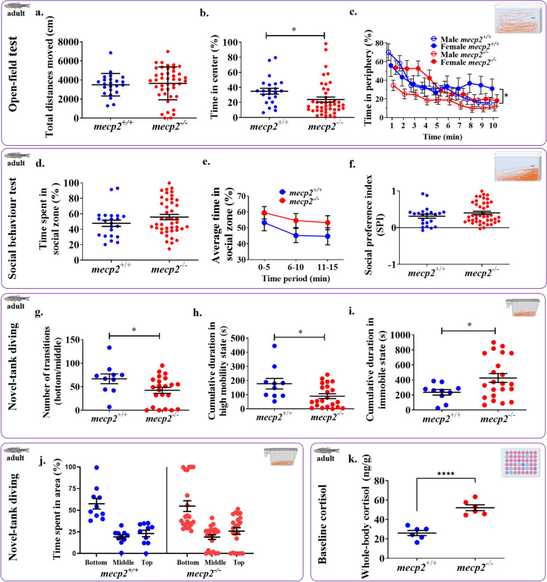 Anxiety-related behaviours and whole-body cortisol levels were altered in adult mecp2−/− fish while locomotion and social preference were unaffected. Locomotion in the open-field (a) was not affected but adult mecp2−/− fish spend significantly less time in the (b) centre zone in the open field compared to the mecp2+/+ group and (c) male mecp2−/− fish showed somewhat less time in the periphery, compared to female mecp2−/− fish. During the presentation of social stimuli, time spent in the social zone (d) was not significantly different in adult mecp2−/− (n = 43) as compared to mecp2+/+ (n = 22). While mecp2−/− fish generally trended towards more time closer to social stimuli than mecp2+/+ fish across the 15 min (e) the SPI was not different between the two groups of fish (f). In a novel tank diving task, the mecp2−/− (n = 22) zebrafish made less bottom-to-middle transitions (g) and spent less time in high-mobility state (h) and more time in the immobile state (i) as compared to mecp2+/+ (n = 10) indicating an increase in bottom-dwelling and freezing behaviours, but overall time spent in bottom, middle, and top areas (j) was not different between the two genotypes. Baseline cortisol levels (k) were higher in experimentally naïve mecp2−/− (n = 6) fish compared to mecp2+/+ (n = 6) zebrafish. *p < 0.05 and ****p < 0.0001. Mean ± SEM