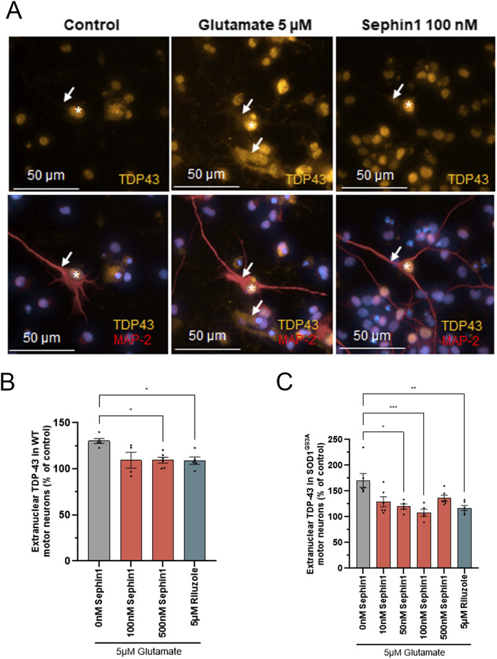 Figure 3. Sephin1 reduces extranuclear TDP-43 localization in primary motor neurons from WT and SOD1G93A rats.
