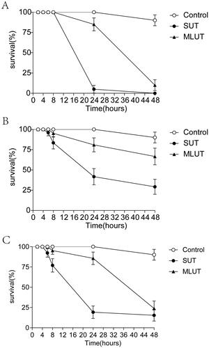 Fig. 1 Survival curves of zebrafish larvae exposed to different uremic solutions. Survival curves of zebrafish treated with uremic solutions from patients 1 (A), 2 (B), and 3 (C). Error bars represent the mean and standard deviation of the survival rate (nā=ā20 per group). Survival rates were significantly lower in the SUT and MLUT groups than in the control group (Pā<ā0.05).