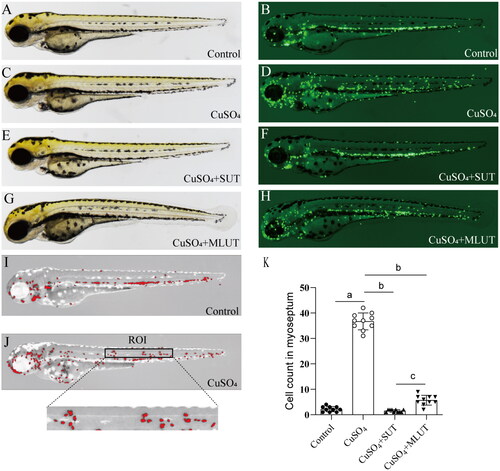 Fig. 2 Quantification of macrophage migration in zebrafish larvae exposed to SUT and MLUT uremic solution. (A-H) Representative bright field and fluorescent images of TG (zlyz:EGFP) larvae at 3 days postfertilization (dpf). (A and B) Untreated fish show the normal distribution of labeled cells, mostly localized in the ventral trunk and tail. (C and D) In copper-treated siblings, macrophages become localized preferentially to a few clusters along the horizontal midline of the trunk and tail. Compared with copper-treated only fish, fish treated with SUT solution (E and F) or MLUT solution (G and H) significantly inhibited macrophage migration induced by copper sulfate. (I and J) Quantification of the macrophage number in myoseptum. (K) Quantification of macrophage migration in zebrafish larva. The number of migrated macrophages was significantly reduced in the SUT and MLUT groups compared to the control group (P < 0.05). Columns, mean; bars, SEM (n = 10; ANOVA; a, vs Control; b, vs CuSO4; c, SUT vs MLUT, P < 0.05).