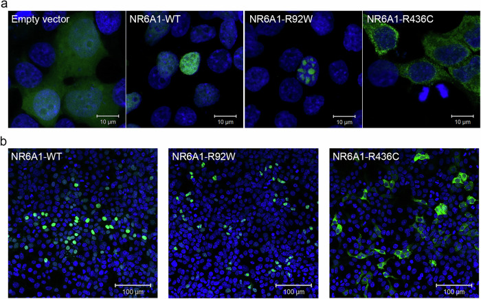 NR6A1 variant localization pattern was studied by overexpression in HEK293 cells and representative high magnification (63X) images are shown from three different trials (