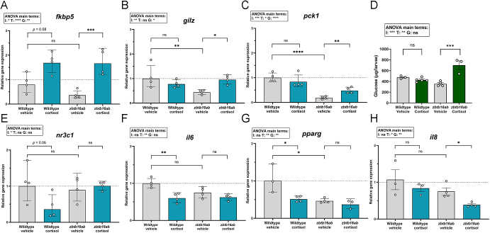Modulation of GR-mediated transactivation and transrepression of genes by zbtb16ab in zebrafish larvae. Five dpf WT zebrafish larvae and zbtb16ab crispants (n = 10–30) were treated with vehicle or 5 μg/mL cortisol for 20 h. Cortisol-induced GR target genes are indicated in the first panels at the upper row: (A) fkbp5 (P = 0.0002), (B) gilz (P = 0.01), (C) pck1 (P = 0.001). (D) Total glucose levels (mean ± S.E.M) from whole-body lysates of either 5 dpf WT zebrafish larvae or zbtb16ab crispants, with increased levels in the cortisol-treated crispants (P = 0.0002). The lower row shows the relative gene expression of GR-repressive genes: (E) nr3c1, (F) il6, (G) pparg, (H) il8 (P = 0.02). The relative gene expression was normalized to actb as a housekeeping gene. Data are presented in geometric means ± geometric S.D. G: genotype, I: interaction, ns: not significant, T: treatment.