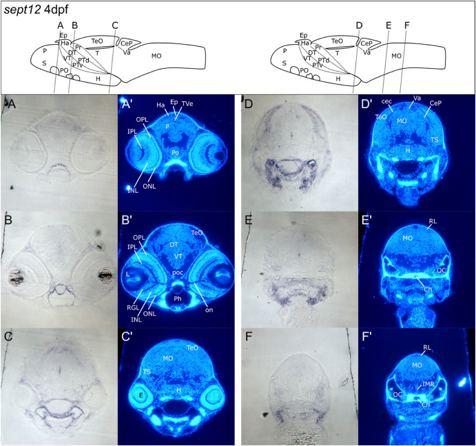 Fig. 5 Transverse sections of 4 dpf zebrafish larvae showing detailed sept12 expression in the CNS. A – F: Epon cross sections of sept12 labeled 4 dpf zebrafish. Brain structures were visualized using Hoechst 33258 (A’ – F′). Levels and angles of sections are displayed in the schematic drawing. Note that the brain schemes display 5 dpf brains and serve only for rough orientation. Sept12 expression displayed in bright field images was prominent in cells at the border between tectum opticum (TeO) and cerebellar commissure (cec in C – D) as well as in a cell cluster at the medial ventricle (C–E). Sept12 was expressed in tissue outside the CNS (C–E). Scale bar: 100 μm. See list for abbreviations. Brain schemes were adapted from Mueller and Wullimann, 2016).