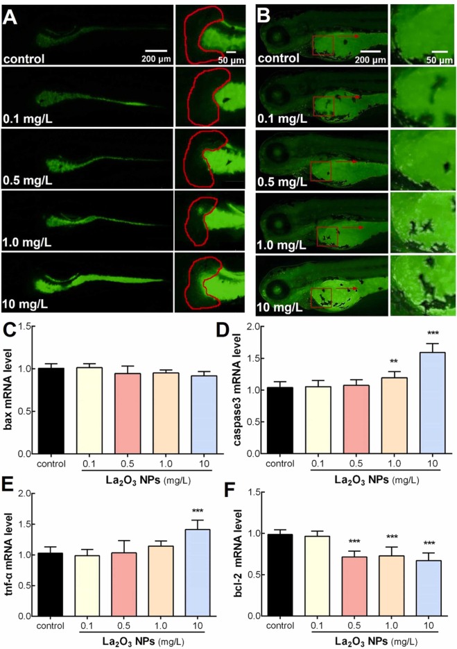 Fig. 2 La2O3 NPs induced oxidative stress and apoptosis in zebrafish larvae. (A) Reactive oxygen species (ROS) content in zebrafish larvae after treatment by La2O3 NPs at 120 hpf. (B) AO staining of zebrafish larvae exposed to 72 hpf. The mRNA expression of (C) bax, (D) caspase3, (E) tnf-a, (F) bcl-2 after zebrafish larvae were exposed to La2O3 NPs. Values are expressed as mean ± SEM. Statistical analysis was done by One-way ANOVA and Bonferroni test, compared to the control group, *p < 0.05, * *p < 0.01, * **p < 0.001.