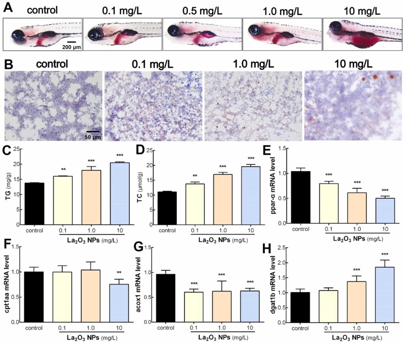 Fig. 7 Effects of La2O3 NPs exposure on lipid metabolism. (A) The Oil red O lipid staining of zebrafish larvae. (B) The Oil red O lipid staining of the liver of adult zebrafish in each group. (C) TG, (D) TC content in the liver of zebrafish in each group. The mRNA expression of (E) ppar-α, (F) cpt1aa, (G) acox1, (H) dgat1b in the liver. Values are expressed as mean ± SEM. Statistical analysis was done by One-way ANOVA and Bonferroni test, compared to the control group, *p < 0.05, * *p < 0.01, * **p < 0.001.