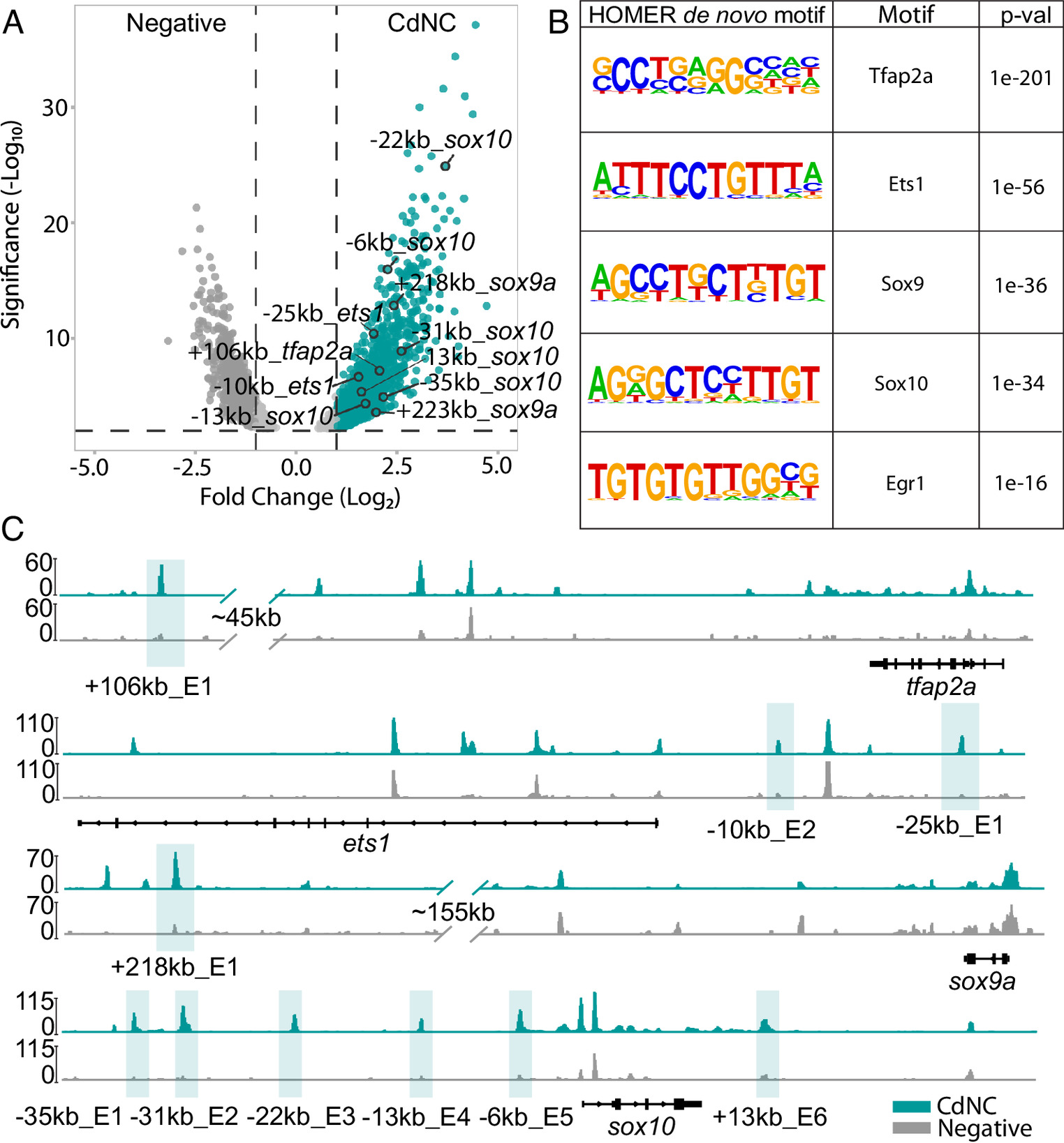 Fig. 2 ATAC-seq and differential chromatin accessibility and transcription factor motif analysis uncovers putative enhancers and transcriptional regulators unique to the CdNC. (A) Volcano plot of merged peaks of sorted bulkATAC-seq shows differentially accessible regions in CdNC (mCherry+) and non-NC/negative cells (mCherry-). (B) Results of HOMER de novo motif analysis showing motif, transcription factor, and associated P-value. (C) IGV genome browser tracks of the ets1, tfap2a, sox9a, and sox10 loci. Highlighted peaks represent putative enhancer regions called by Diffbind (turquoise track = CdNC, gray track = negative).