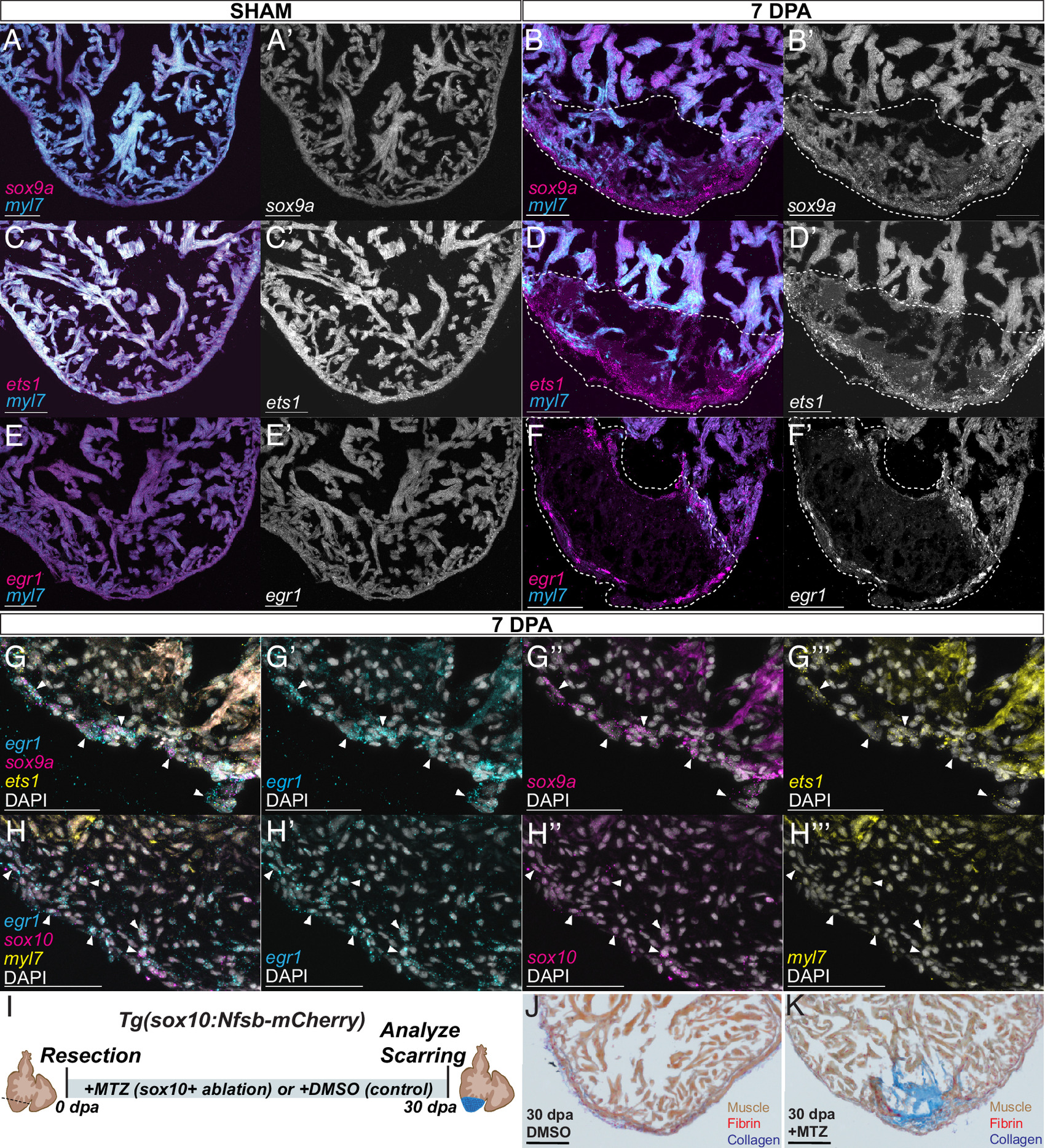 Fig. 4 A developmental CdNC subcircuit is expressed during adult cardiac regeneration. HCR staining of sham and injured 7dpa ABWT hearts, respectively, for myl7 and (A and B) sox9a (n = 12/12), (C and D) ets1 (n = 11/11), and (E and F) egr1 (n = 15/15). (A′–F′) Grayscale of respective sox9a, ets1, and egr1 stainings. (Scale bar, 100 μm.) (G) HCR costaining on ABWT 7dpa hearts for sox9a, egr1, ets1, and DAPI (n = 8/8). Arrows indicate some of the cells positive for all three probes. Single channel images, with DAPI, of, sox9a, egr1, and ets1 are shown respectively in (G′ and G″′). (Scale bar, 50 μm.) (H) HCR costaining on ABWT 7dpa hearts for sox10, egr1, myl7, and DAPI (n = 10/11). Arrows indicate a subset of the cells double-positive for sox10 and egr1 probes. Single channel images, with DAPI, of egr1, sox10, and myl7 are shown respectively in (H′ and H″). (I) Diagram of the sox10+ ablation scheme. Tg(sox10:Nfsb-mCherry) injured fish are maintained in MTZ for the duration of the regeneration time course and hearts are harvested at 30 dpa. (J) Injured hearts maintained in DMSO to 30 dpa retain little scarring (n = 3/3), whereas (K) injured hearts maintained in MTZ, ablating sox10+ cells, maintain a scar to 30 dpa (n = 5/5). (Scale bar, 100 μm.)