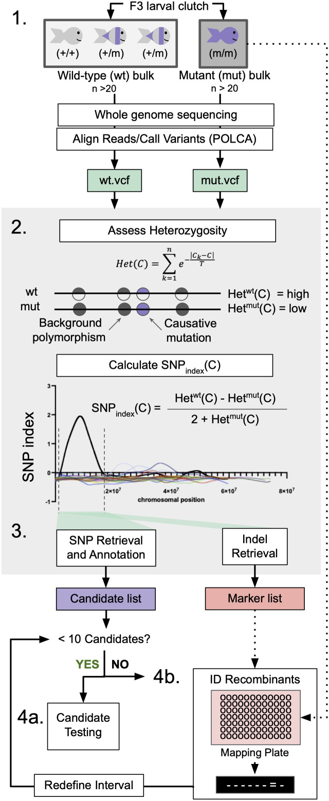 1. Bulk Segregant Analysis: animals are sorted by phenotype and pooled to generate wild-type (wt) and mutant (mut) genomic DNA for whole-genome sequencing. Sequencing data is aligned and evaluated for variance using POLCA which outputs VCF files for wt and mut samples. gDNA for additional mutant animals can be saved for downstream analyses. 2. Heterozygosity is calculated in a sliding window across wt and mut genomes, where C is the coordinate at the center of each 10,000 bp window. These values are used to calculate the SNP index in order to define a homozygous interval; dashed lines indicate interval bounds. 3. Whereswalker extracts SNPs and indels that segregate appropriately with the mutant phenotype to generate a list of candidate SNPs and a list of indel markers. Steps 2 and 3 are executed in a single command by the WheresWalker script. 4a. If sufficiently few candidates have been identified, the genes can be targeted with CRISPR/Cas9. 4b. If the number of targets is intractable, the interval can be refined by identifying recombinants. This can be repeated until a sufficiently short candidate list has been generated.