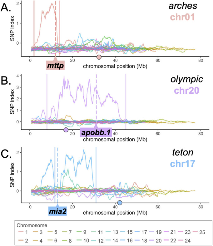 Fig 3 WheresWalker identifies the correct chromosomal region for three dark yolk loci.