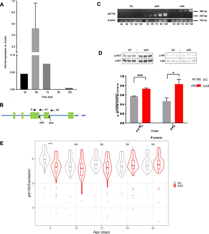 Grb10a is successfully knocked down in zebrafish injected with splice-blocking antisense oligonucleotides. (A) Grb10a qPCR of WT embryos (24–120 hpf, triplicated, n = 5 embryos per well). Data are shown as gene expression relative to β-actin with maximum levels at 48 hpf. (B) Schematic of the first five exons of the zebrafish grb10a gene. 5’ splice sites are highlighted with the forward and reverse primer triad indicated. (C) Multiplexed PCR amplification of the e3i3 and e4i4 splice site in embryos treated with either Standard Control (SC) morpholino, e3i3, or e4i4. β-actin was used as a positive control. (D) Western blot results of phosphorylated versus total protein ratios for two major signalling molecules of the insulin signalling pathway: AKT and S6. Quantitation using densitometry depicts mean + SEM. Activation of both proteins was found to be significantly elevated in KD zebrafish compared to SC (n = 3, unpaired t-test *** p = 0.0007, * p = 0.04). (E). Expression of grb10 mRNA throughout early life. Grb10 expression is decreased at 5 dpf in the KD but thereafter levels in the KD are not different from those in the SC (Wilcoxon rank sum test. **** p = 0.00003)