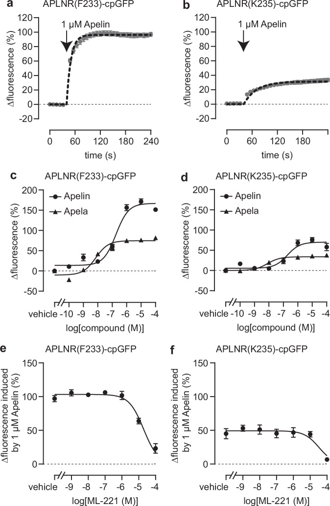 Stimulation with Apelin and Apela (arrow indicates timepoint of ligand addition) led to a significant increase of APLNR(F233)-cpGFP (