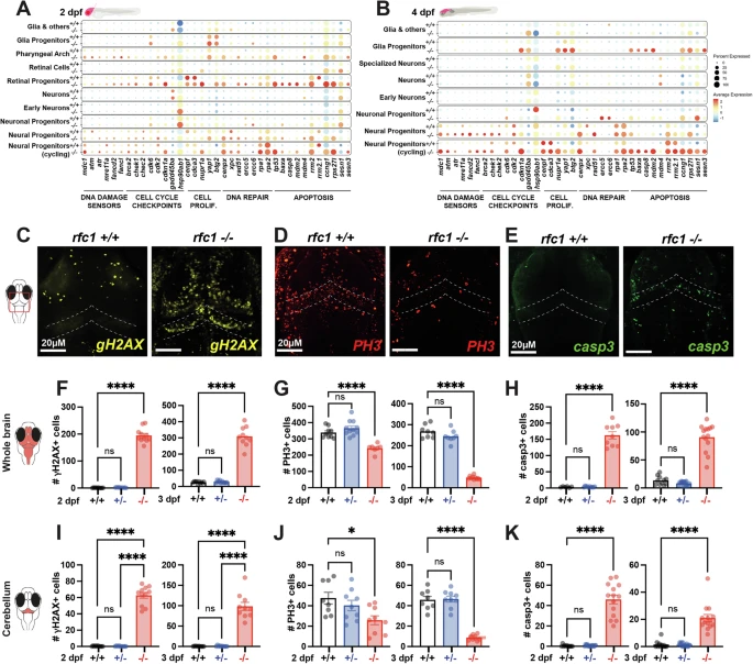 Fig. 5 RFC1 loss-of-function impairs neural progenitor proliferation and induces cell death.A, B Dot plots showing the expression of genes related to DNA damage sensing, cell cycle checkpoints, proliferation, DNA repair, and apoptosis across individual scRNA-seq clusters at 2 dpf (A) and 4 dpf (B) in rfc1+/+ and rfc1−/− brains (see Supplementary Fig. S4B, C for cluster annotations). Icons are created in BioRender. Samarut, E. (2025) https://BioRender.com/k7eukl7. C–E Immunostaining in the developing brain at 3 dpf using: C anti-γH2AX antibody (marker of DNA double-strand breaks), D anti-phospho-Histone H3 (PH3) antibody (mitotic marker), E anti-cleaved caspase-3 (casp3) antibody (apoptosis marker). Dotted lines delineate the developing cerebellum. F–H Quantification of γH2AX⁺, PH3⁺, and caspase-3⁺ cells in the whole brain of rfc1+/+, rfc1+/–, and rfc1–/– larvae at 2 and 3 dpf. F γH2AX-positive cells: 2 dpf (n = 10 rfc1+/+, 9 rfc1+/–, 11 rfc1–/–), 3 dpf (n = 10 rfc1+/+, 10 rfc1+/–, 10 rfc1–/–), N = 2. G PH3-positive cells: 2 dpf (n = 9 rfc1+/+, 11 rfc1+/–, 7 rfc1–/–), 3 dpf (n = 8 rfc1+/+, 8 rfc1+/–, 8 rfc1–/–), N = 2. H Casp3-positive cells: 2 dpf (n = 6 rfc1+/+, 10 rfc1+/–, 9 rfc1–/–), 3 dpf (n = 11 rfc1+/+, 15 rfc1+/–, 14 rfc1–/–), N = 3. (I–K) Quantification of γH2AX⁺ (I), PH3⁺ (J), and caspase-3⁺ (K) cells in the cerebellum of rfc1+/+, rfc1+/–, and rfc1–/– larvae at 2 and 3 dpf. I γH2AX-positive cells: 2 dpf (n = 10 rfc1+/+, 10 rfc1+/–, 11 rfc1–/–), 3 dpf (n = 10 rfc1+/+, 10 rfc1+/–, 10 rfc1–/–), N = 2. J PH3-positive cells cells: 2 dpf (n = 8 rfc1+/+, 9 rfc1+/–, 9 rfc1–/–), 3 dpf (n = 8 rfc1+/+, 9 rfc1+/–, 10 rfc1–/–), N = 2. K Casp3-positive cells: 2 and 3 dpf (n = 11 rfc1+/+, 15 rfc1+/–, 14 rfc1–/–), N = 3. Data in (F–K) are presented as mean ± SEM; individual dots represent biological replicates. Statistical analysis: one-way ANOVA with multiple comparisons. ns not significant (p > 0.05); * (p ≤ 0.05); ** (p ≤ 0.01); *** (p ≤ 0.001); **** (p ≤ 0.0001). Scale bars: 20 μm (A–C), 1 μm (D).