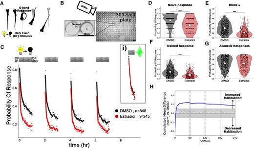 Fig. 1 Estradiol increases habituation learning. A) In response to a dark flash (DF), larval zebrafish perform a large turning maneuver termed an “O-bend” response. B) High-throughput setup for recording and quantifying responsiveness using a high-speed camera recording at 444hz observing larvae in 300-well plates. Scale bar = 10 mm. C) Treatment with estradiol (red) results in more rapid and profound decreases in the probability of response to DF stimuli during habituation training relative to DMSO vehicle controls (black). DF stimuli are delivered at 1-minute intervals, in 4 blocks of 60 stimuli, separated by 1 hour of rest (from 0:00-7:00). At 1.5 hours later a block of 30 vibration stimuli are delivered at 1-minute intervals (i). Each dot is the probability of response to one DF. Lines are smoothed in time with a Savitzky–Golay filter (window = 15 stimuli, order = 2). D–G) Distributions responsiveness for different epochs of the experiment. Each dot is the per-fish average of the epoch. Statistical significance was calculated using Mann-Whitney U test, *** = P < .001. D) the naive response to the first 5 DF stimuli; E) the mean response to the remaining DF stimuli in the Block 1 (DFs 6:60); F) the trained response to the last 45 DFs in all 4 training blocks (DFs 16:60,76:120,136:180,196:240); G) the 30 vibration stimuli delivered with a tap from a solenoid on the 300-well plate platform. H) Cumulative mean difference (CMD) plot quantifying relative habituation performance after estradiol treatment. These plots display the cumulative average differences in the mean response across larvae of the treatment group (estradiol) relative to the control group (DMSO). Difference from 0 reflect a divergence in the change in responsiveness across the 240 DF stimuli in the 4 training blocks, with positive values reflecting increased habituation. The width of the line is a bootstrapped 99.5% CI. The gray boxed region reflects the expected nonsignificant effect size (3). Treatment groups are: Estradiol = 10µM estradiol treatment (n = 345 fish); DMSO = 0.1% DMSO vehicle controls (n = 548 fish).