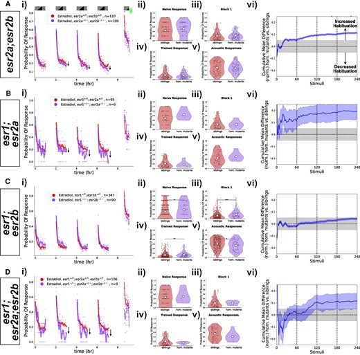 Fig. 4 Double and triple mutant combinations of esr1, esr2a, and esr2a do not show habituation deficits after treatment with estradiol. A) Homozygous esr2a(−/−);esr2b(−/−) double mutants (n = 109 fish) do not show impaired habituation relative to double heterozygous or homozygous sibling controls ((+/?);(+/?), n = 120 fish). B) Homozygous esr1(−/−);esr2a(−/−) double mutants (n = 6 fish) do not show impaired habituation relative to double heterozygous or wild-type sibling controls ((+/?);(+/?), n = 95 fish). C) Homozygous esr1(−/−);esr2b(−/−) double mutants (n = 90 fish) do not show impaired habituation relative to double heterozygous or wild-type sibling controls ((+/?);(+/?), n = 347 fish). D) Homozygous esr1(−/−);esr2a(−/−);esr2b(−/−) triple mutants (n = 9 fish) do not show impaired habituation relative to triple heterozygous or wild-type sibling controls ((+/?);(+/?);(+/?), n = 106 fish). i)-vi) For each lettered section: i) Responsiveness to stimuli comparing homozygous mutants to sibling controls (heterozygous or wild-type). Each dot is the probability of response to one stimulus. Lines are smoothed in time with a Savitzky–Golay filter (window = 15 stimuli, order = 2). ii)-v) Distributions responsiveness for different epochs of the experiment. Each dot is the per-fish average of the epoch. Statistical significance was calculated using Mann-Whitney U test, * = P < .05, ** = P < .01, *** = P < .01. ii) the naive response to the first 5 DF stimuli; iii) the mean response to the remaining DF stimuli in the Block 1 (DFs 6:60); iv) the trained response to the last 45 DFs in all 4 training blocks (DFs 16:60,76:120,136:180,196:240); v) the 30 vibration stimuli delivered with a tap from a solenoid on the 300-well plate platform. vi) Cumulative mean difference (CMD) plot quantifying habituation performance of mutants relative to sibling controls.