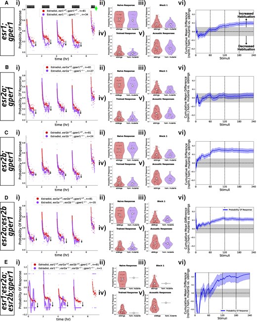 Fig. 5 Double, triple, and quadruple mutant combinations of esr1, esr2a, esr2a, and gper1 do not show habituation deficits after treatment with estradiol. A) Homozygous esr1(−/−);gper1(−/−) double mutants (n = 34 fish, purple) do not show impaired habituation relative to double heterozygous or wild-type sibling controls (n = 81 fish, red). B) Homozygous esr2a(−/−);gper1(−/−) double mutants (n = 27 fish, purple) do not show impaired habituation relative to double heterozygous or wild-type sibling controls (n = 81 fish, red). C) Homozygous esr2b(−/−);gper1(−/−) double mutants (n = 24 fish, purple) do not show impaired habituation relative to double heterozygous or wild-type sibling controls (n = 81 fish, red). D) Homozygous esr2a(−/−);esr2b(−/−);gper1(−/−) triple mutants (n = 35 fish, purple) do not show impaired habituation relative to heterozygous or wild-type sibling controls (n = 81 fish, red). E) A single homozygous esr1(−/−);esr2a(−/−);esr2b(−/−);gper1(−/−) quadruple mutant (n = 1 fish, purple) does not appear to show impaired habituation relative to heterozygous or wild-type sibling controls (n = 81 fish, red). i)–vi) For each lettered section: i) Responsiveness to stimuli comparing homozygous mutants to sibling controls (heterozygous or wild-type). Each dot is the probability of response to one stimulus. Lines are smoothed in time with a Savitzky–Golay filter (window = 15 stimuli, order = 2). ii)–v) Distributions responsiveness for different epochs of the experiment. Each dot is the per-fish average of the epoch. Statistical significance was calculated using Mann-Whitney U test. ii) the naive response to the first 5 DF stimuli; iii) the mean response to the remaining DF stimuli in the Block 1 (DFs 6:60); iv) the trained response to the last 45 DFs in all 4 training blocks (DFs 16:60,76:120,136:180,196:240); v) the 30 vibration stimuli delivered with a tap from a solenoid on the 300-well plate platform. vi) Cumulative mean difference (CMD) plot quantifying habituation performance of mutants relative to sibling controls. As mutant larvae were all derived from the same experiments, the sibling control data (red) is the same in A–E).