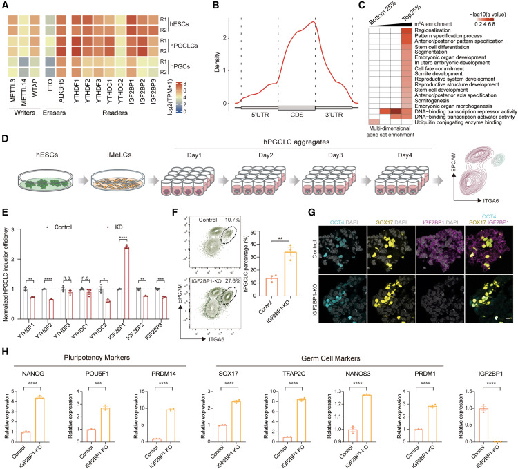 Fig. 1 The m6A reader IGF2BP1 suppresses hPGCLCs induced from hESCs (A) Expression levels of m6A writers, erasers, and readers in hESCs, hPGCLCs, and hPGCs. (B) Enrichment of m6A modifications across mRNA transcriptome in hESCs. CDS: coding sequence. UTR: untranslated regions. (C) Heatmap showing gene set enrichment analysis for m6A-modified genes in hESCs. (D) Illustration of hESC to hPGCLC differentiation strategy. (E) Normalized hPGCLC induction efficiency for CRISPRi screening the m6A readers (mean ± SEM, n = 3, biological replicates; n.s., not significant, ∗p < 0.05, ∗∗p < 0.01, ∗∗∗p < 0.001, ∗∗∗∗p < 0.0001, unpaired t test). (F) Flow cytometry showing the percentage of day-4 hPGCLCs induced from control and IGF2BP1-KO hESCs (mean ± SEM, n = 3, biological replicates; ∗∗p < 0.01, unpaired t test). (G) Immunofluorescence for OCT4 (cyan), SOX17 (yellow), and IGF2BP1 (magenta) for day-4 hPGCLC aggregates induced from control and IGF2BP1-KO hESCs. DAPI (gray) is counterstained for nuclei. Scale bar: 10 μm. (H) qPCR showing the expression of pluripotency and germ cell markers in control and IGF2BP1-KO day-4 hPGCLC aggregates (mean ± SEM, n = 3, technical replicates; ∗∗∗p < 0.001, ∗∗∗∗p < 0.0001, unpaired t test). See also Figure S1 and Tables S1 and S7.