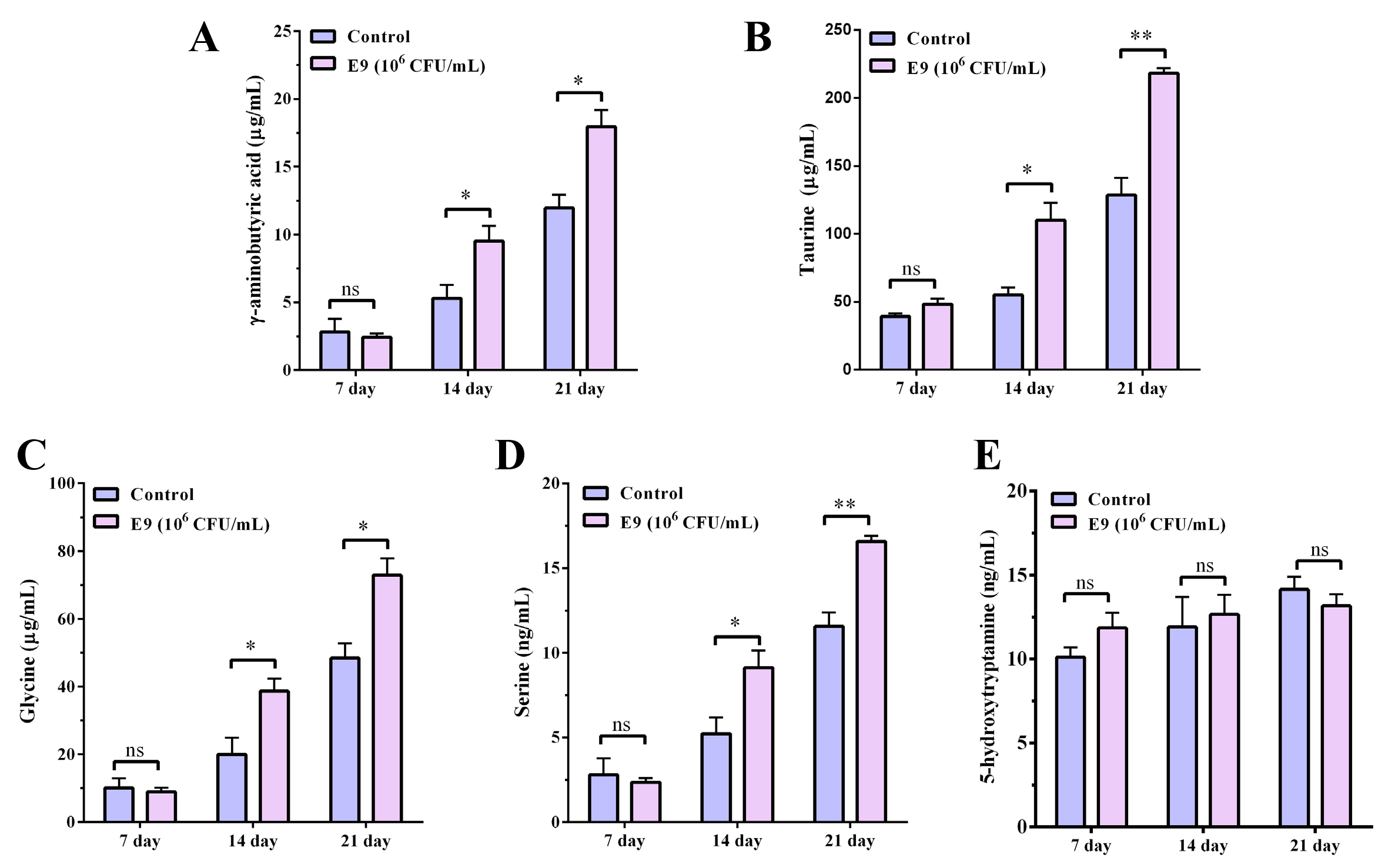Fig. 1 Effects of Lactobacillus reuteri E9 on inhibitory neurotransmitter levels in zebrafish. (A) γ -Aminobutyric acid (GABA), (B) 5-hydroxytryptamine (5-HT), (C) Taurine, (D) Glycine, and (E) Serine levels in zebrafish after 7, 14, and 21 days of E9 treatment. Data are presented as mean ± SEM (n = 10 per group). Experimental group was treated with E9 at 106 CFU/mL versus control group. ns denotes no significant difference and * represents p < 0.05, **: p < 0.01.