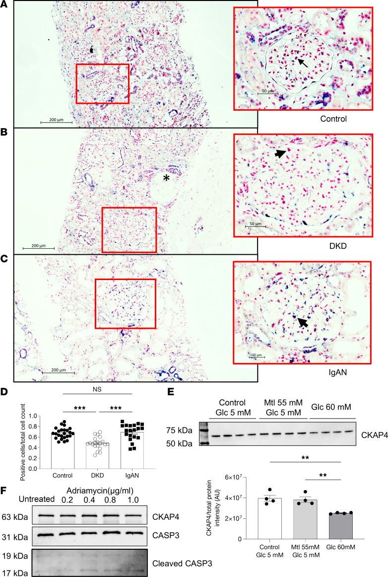 CKAP4 mRNA was detected using in situ hybridization in control (A), DKD patient biopsies (B), and IgAN patient biopsies (C). A purple/dark blue staining in the nuclear region characterizes cells positive for CKAP4 expression. Negative cells are characterized by a pink/red nuclear staining. The ratio of positive cells to total glomerular cells was used to quantify the extent of CKAP4 gene expression reduction in DKD (D). Completely differentiated human podocytes (HPODs) treated for 2 weeks with 60 mM glucose showed a 20%–30% reduction of CKAP4 (E). Treatment of HPODs with adriamycin for 24 hours does not cause a decrease in CKAP4 at protein level, although cleaved CASP3 level is increased in treated cells, indicating apoptosis (F). Unedited/uncropped total protein blots used for normalization calculation are provided as supplemental materials. Error bars represent average ± SEM. **P < 0.01, ***P < 0.001. D: 1-way ANOVA with Tukey’s multiple comparisons test, n = 25 (controls), 20 (DKD), 22 (IgAN) glomeruli. We scored 5 biopsies from 5 patients per group (4 for IgAN), and 5 (for controls, IgAN) or 4 (for DKD) glomeruli per biopsy. E: n = 4 replicates, 1-way ANOVA with multiple comparisons. The asterisk in B indicates a sclerotic glomerulus. The arrows in the respective zoomed-in sections of AC indicate cells showing positive staining for CKAP4. CASP3, caspase-3; CKAP4, cytoskeleton associated protein 4; DKD, diabetic kidney disease; Glc, glucose; IgAN, immunoglobulin A nephropathy, Mtl, mannitol.