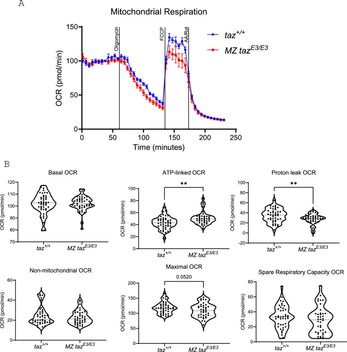 Fig. 4 Mitochondrial dysfunction in tafazzin-deficient embryos. (A) Diagram showing oxygen consumption rates (OCR) for wildtype (blue line) and MZ tazE3/E3 (red line) zebrafish embryo following the addition of oligomycin, FCCP, and rotenone. Error bars represent the standard error of the mean (SEM). (B) Oxygen consumption rates for basal, non-mitochondrial respiration, maximal, proton leak, ATP-linked respiration and spare respiratory capacity. Each dot in the figure represents the value of one independent embryo. Results showing three independent experiments. Each experiment included 15 embryos per genotype. *p<0.05; **p<0.01.