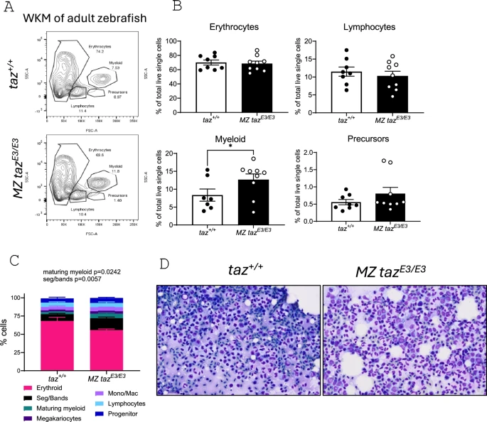 Fig. 6 Adult tafazzin-deficient zebrafish exhibited increased MLCL: CL ratio in heart and whole kidney marrow but survive until adulthood. (A) Flow cytometric analysis and (B) quantification of blood cells. (C) Differential cell counts in kidney marrows and (D) kidney touch preparations of wildtype and tafazzin mutants at 60X magnification *p<0.05.